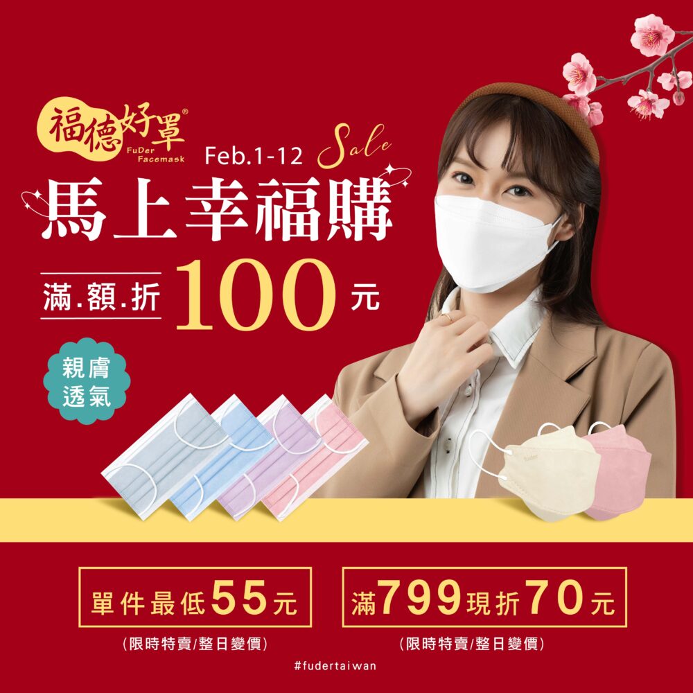 𝟬𝟮𝟬𝟮踏春舞蛇保安康,自𝟬𝟭/𝟮𝟮至𝟬𝟮/𝟭𝟮。全館口罩商品,多件組享𝟖𝟖折優惠;𝟮號限時特賣,立體款𝟏𝟎入最低下殺每盒$𝟓𝟓,平面款𝟑𝟎入最低下殺每盒$𝟖𝟖,平面款𝟓𝟎入最低下殺每盒$𝟗𝟗;即日起至𝟭𝟮號,加碼優惠券後最高折𝟔𝟬𝟬元,須滿低消𝟵𝟵𝟵元;品牌會員♚加入即享𝟓𝟬點與新客優惠券($𝟒𝟗𝟗折𝟓𝟬);消費積點免費換好禮,月月限量會員回購券($𝟑𝟗𝟗折𝟒𝟎)